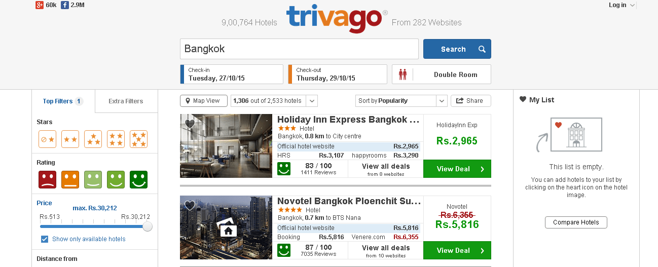 Trivago Sign In - Enter your email address to start.. This means that while users decide on trivago which hotel best suits their needs, the booking process itself is completed through the booking sites (which are linked to our website). We help millions of travelers each year compare deals for hotels and accommodations. Show my password hide my password. The prices shown come from numerous hotels and booking websites. Enter your email address to start.